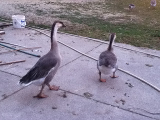That's George on the left, and Fred on the right. Our geese that hatched over 5 months ago. Both of these boys were found last night all wobbly and panting for air. So Dave and I held onto them while we put the others into their pens for the night and for about another 1/2 an hour. George was my charge and he was just breathing so heavy I didn't know what else to do for him except keep him warm and talk to him to calm him down.